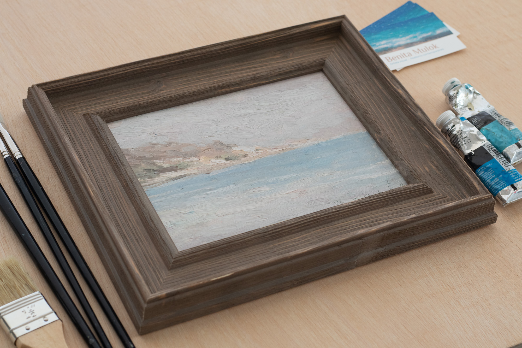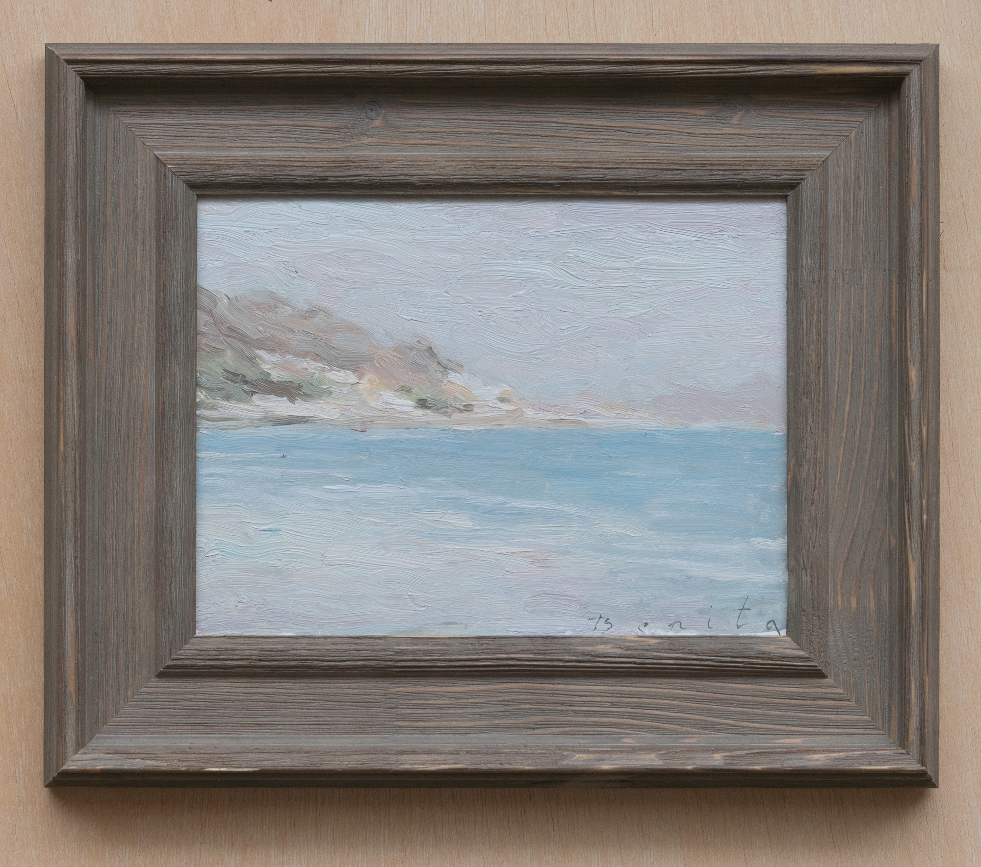 Painted alla prima on location, this piece focuses on subtle colour shifts and the calm movement of the sea, with the distant shoreline dissolving into atmosphere.