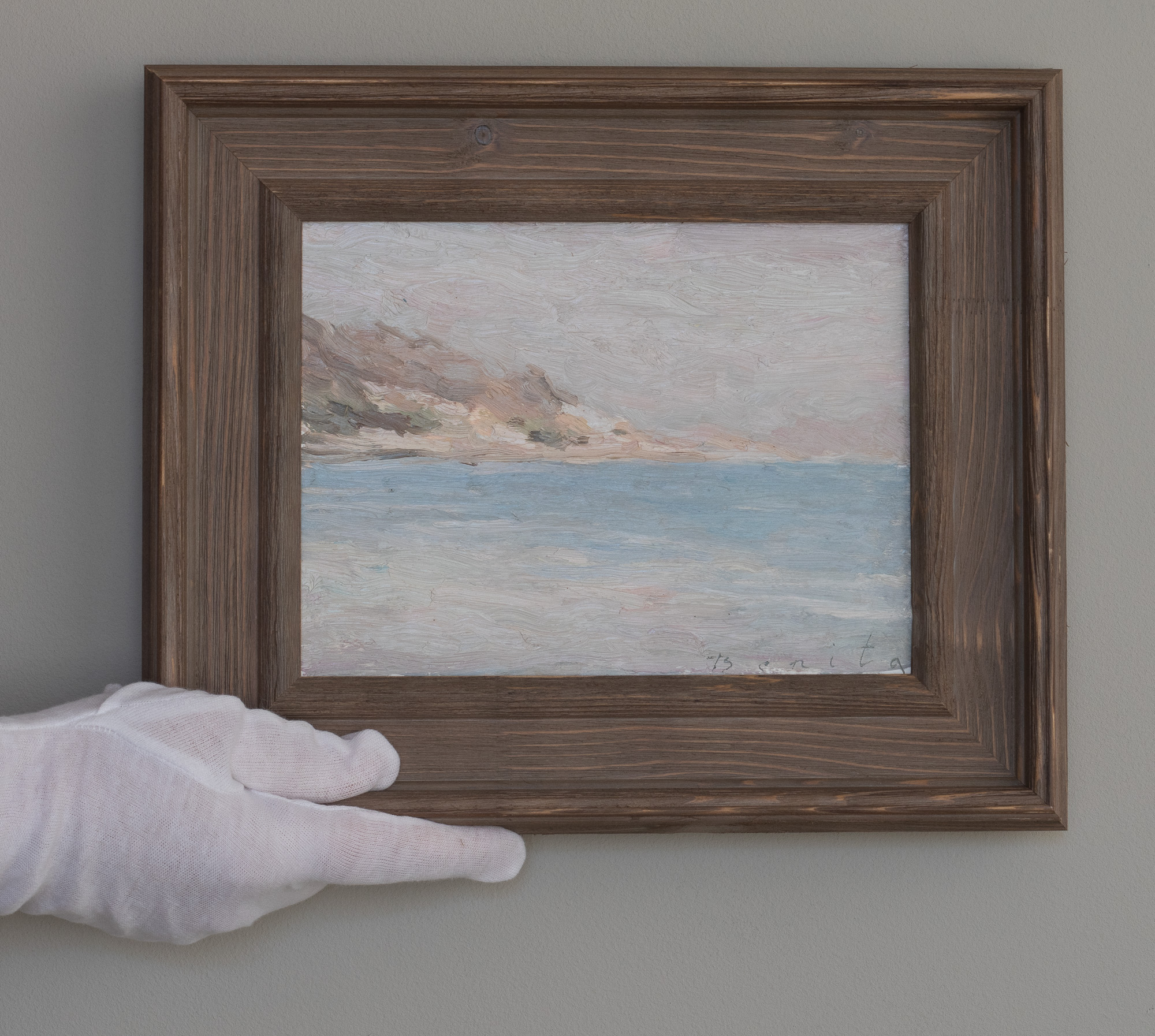 Pintada alla prima del natural, esta obra se centra en los matices sutiles de color y el movimiento calmado del mar, con la línea de la costa desvaneciéndose en la atmósfera.